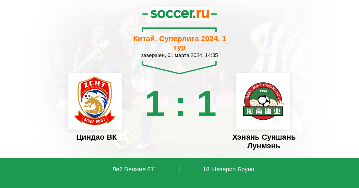 Протокол матча Циндао ВК против Хэнань Суншань Лунмэнь