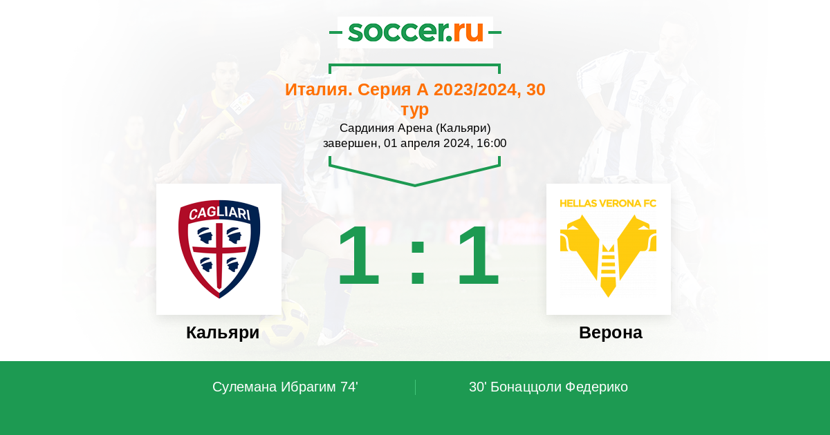 Протокол матча Кальяри против Верона