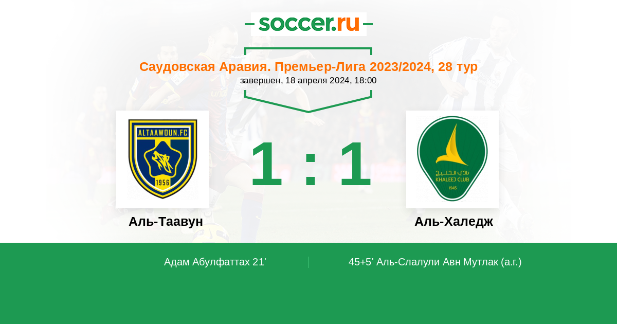 21' (1:0) Адам Абулфаттах (88) (Аль-Куваукиби Мохаммед (22))