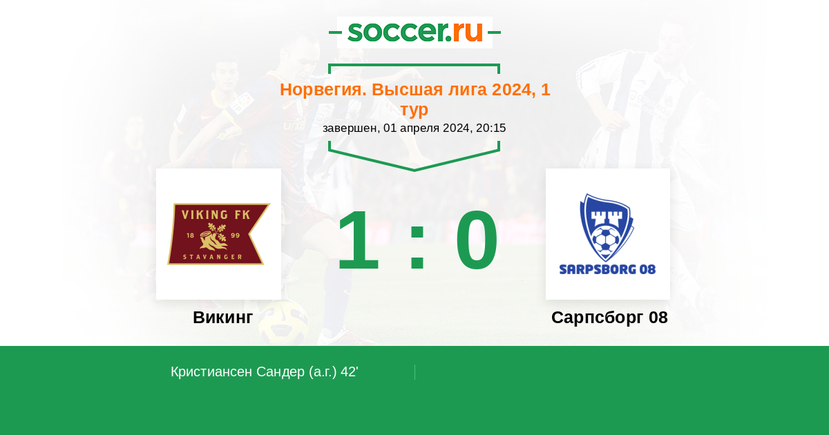 42' (1:0) Автогол Кристиансен Сандер (72)
