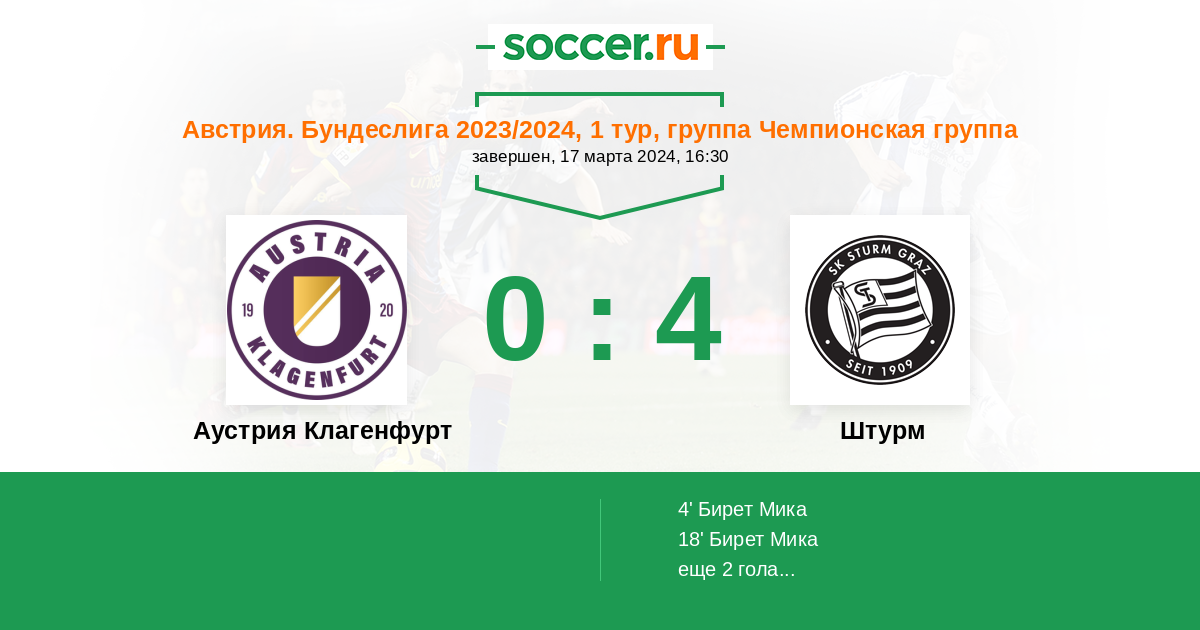 Протокол матча Аустрия Клагенфурт против Штурм
