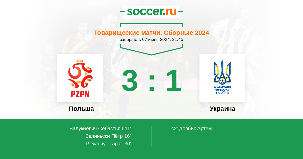 Первый тайм украинцы дурака валяли, второй тайм равная игра. Вывод : вратаря сб.Украины Бущана в основном составе на Евро мы не увидим. Странные решения в завершающей стадии тоже удивили. 2 гола поляки забили после стандартов, на заметку тренеру Реброву. Хотя товарищеская игра и отсутствие сыгранности. Бывший украинец и игрок Карпат Тарас Романчук забил свой первый гол за сб. Польши.