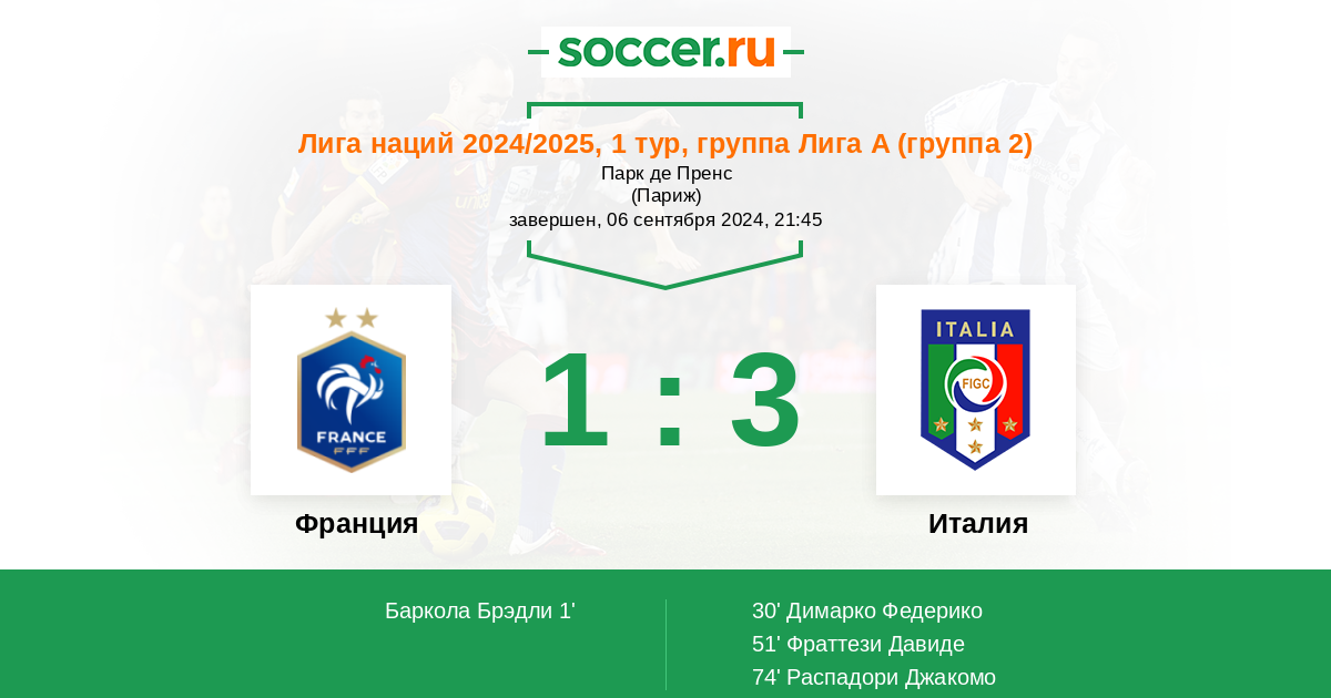 Ни одна из команд не имеет явного преимущества, поэтому сложно предсказать победителя в этом матче. Давайте пожелаем обеим командам товарищеской игры, когда итальянские и французские футболисты будут прощаться друг с другом.