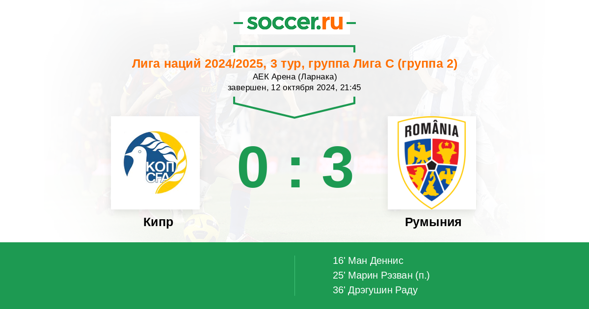 Сборная Румынии,участница предыдущего чемпионата Европы ,где выступили успешно , но проиграв в плей оф голландцам, свои последние игры сыграли результативно, обыграли Литву и Косово с общим счётом 6-1. По этим соперникам силу команды не определить , сегодня соперник будет покрепче , Кипр взял верх над Литвой 1-0 ,но я думаю , что и здесь румыны будут сильнее.