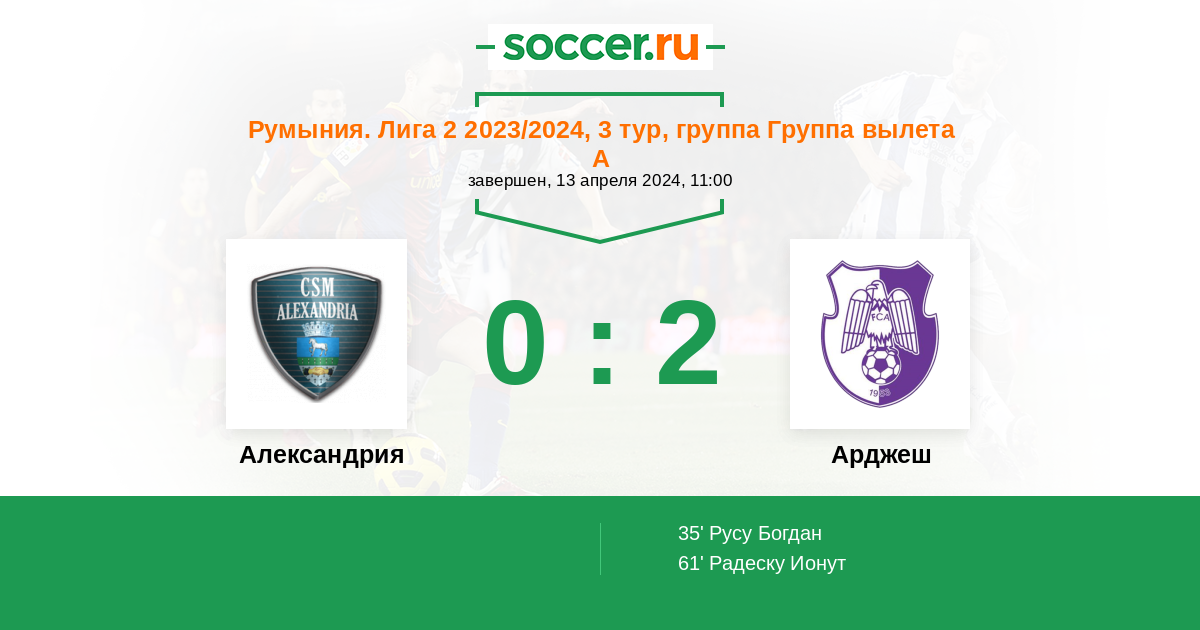 Протокол матча Александрия против Арджеш