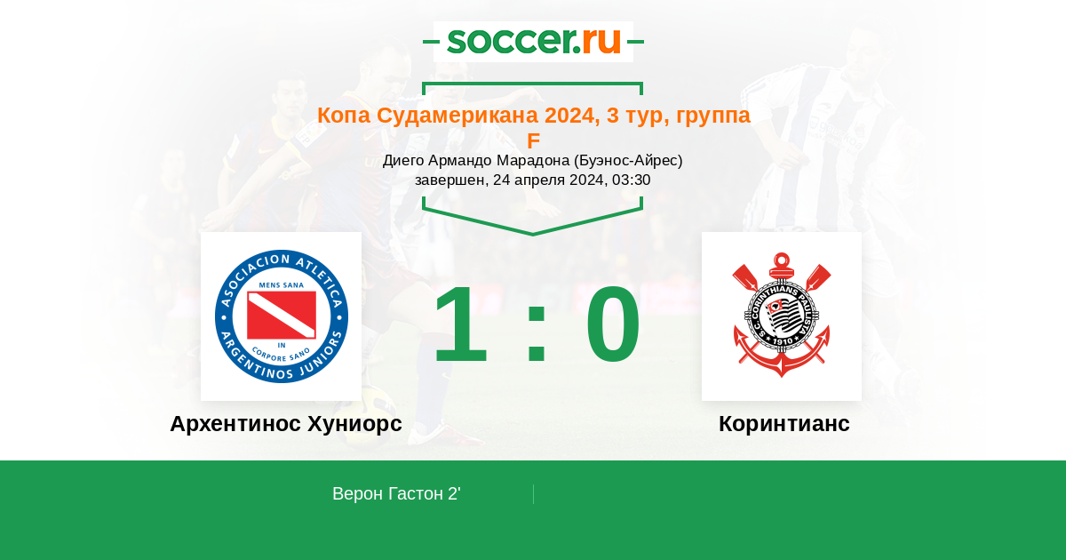 2' (1:0) Верон Гастон (10) (Виверос Эмилиано (29))