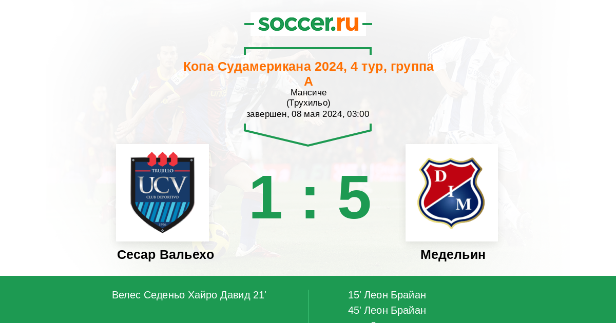 15' (0:1) Леон Брайан (27) (Монсалве Мигел (10))