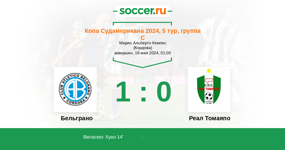 14' (1:0) Веласкес Хуан (53) (Ролон Эстебан (16))