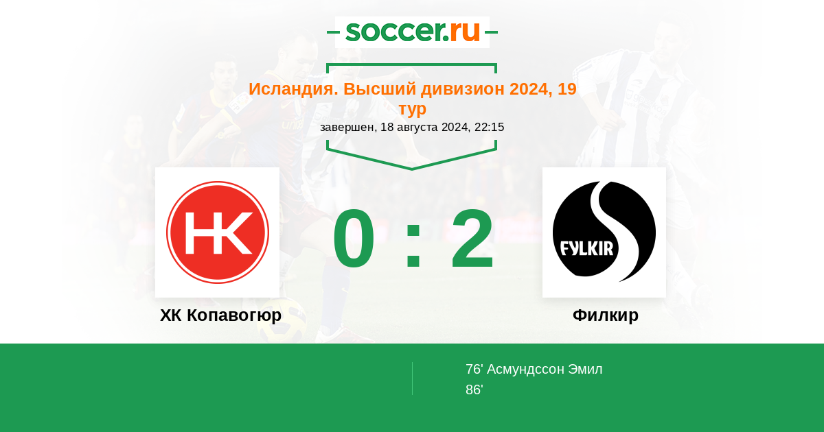 76' (0:1) Асмундссон Эмил (16) (T. G. Hafthorsson)