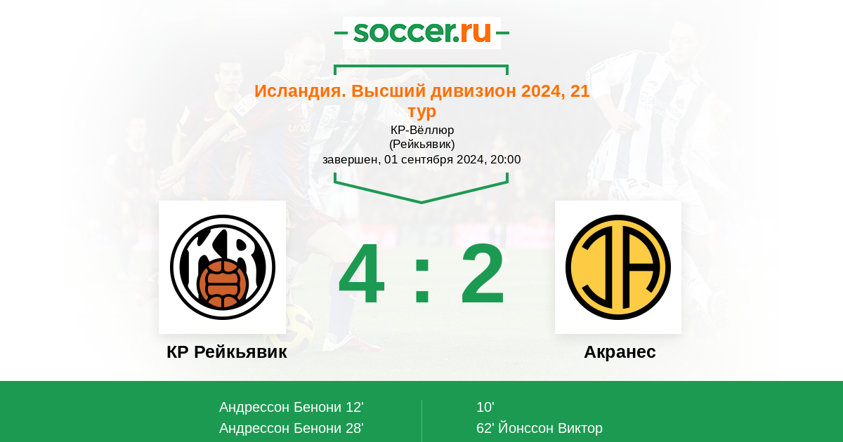 35' (3:1) Андрессон Бенони (9) (Сигурйонссон Атли (23))