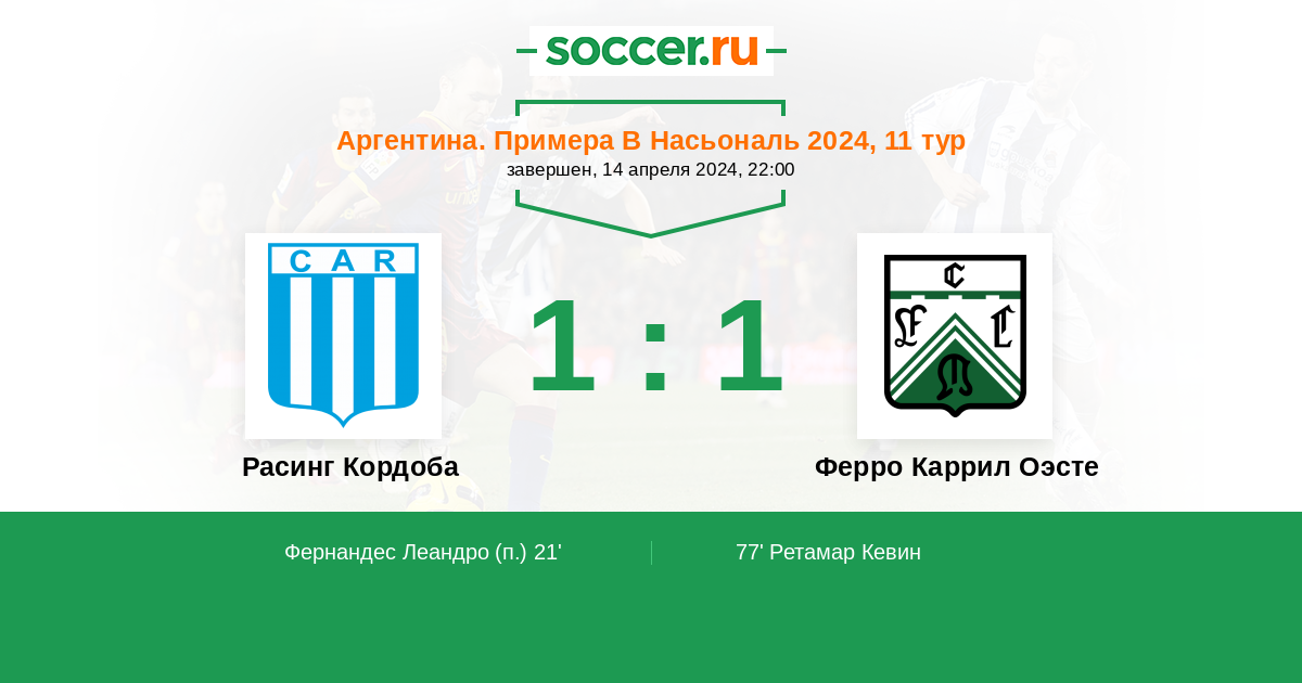 Протокол матча Расинг Кордоба против Ферро Каррил Оэсте