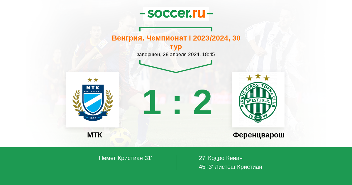 Протокол матча МТК против Ференцварош
