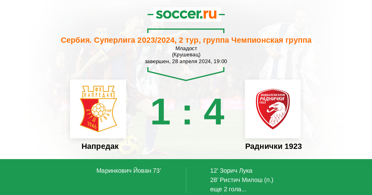 12' (0:1) Зорич Лука (3) (Ристич Милош (27))