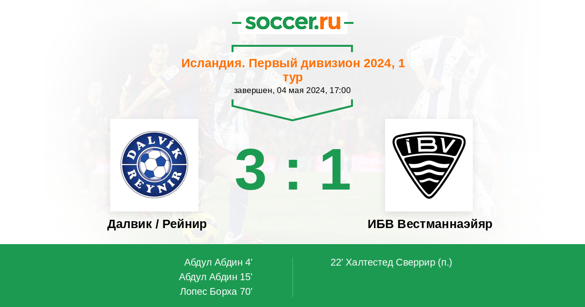 Протокол матча Далвик / Рейнир против ИБВ Вестманнаэйяр