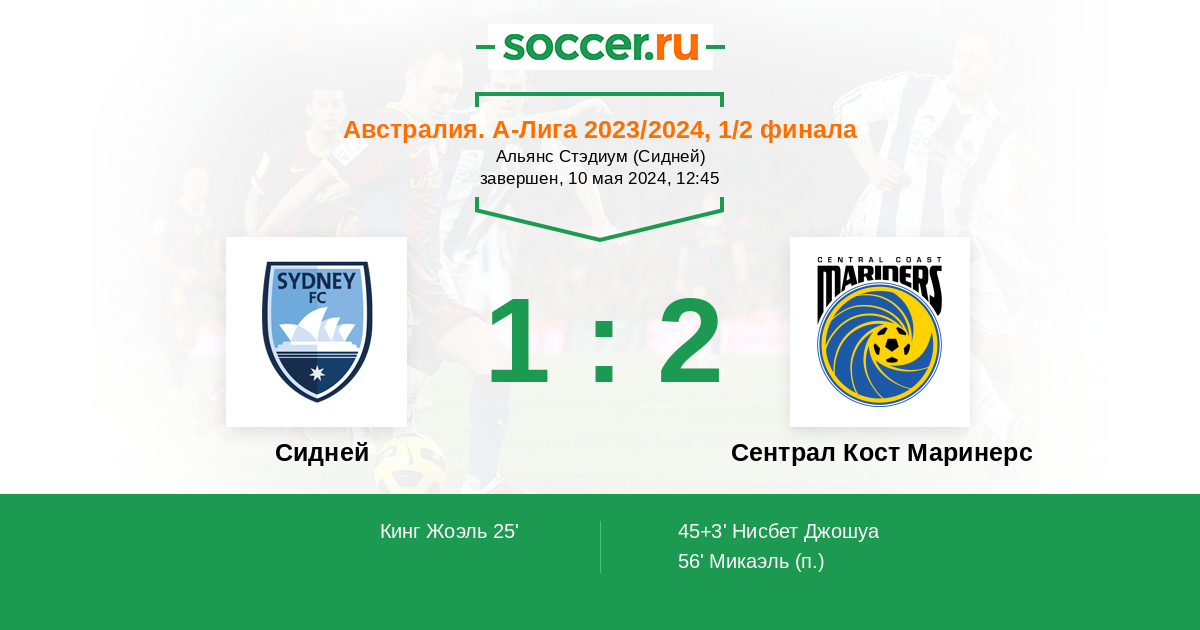 Протокол матча Сидней против Сентрал Кост Маринерс