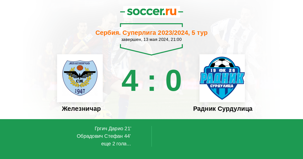 21' (1:0) Гргич Дарио (22) (Йованович Страхинья (90))