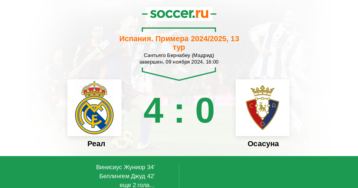 Игровых проблем хватает, и одна из них ― плохая форма Мбаппе, который порет слишком много моментов. Однако, по словам Анчелотти, у него есть план, да и Родриго готов вернуться ― он вернет баланс. А "Осасуна" хоть и в полном порядке, и даже за топ-4 рубится, но на выезде играет слабо. Особенно плохо ― на "Бернабеу": в последних 15 матчах на этом стадионе у нее 13 поражений. Предположим, что "Реал" все же победит.
