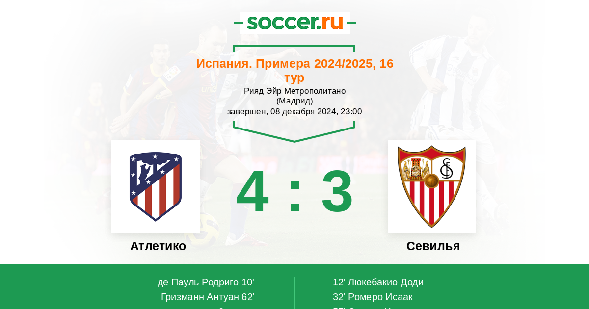 Атлетико - Севилья ! Интересный матч скорее всего нас ожидает . Команды вполне мотивированны на эту игру , особенно хозяева , идя третьими они конечно видят как периодически " спотыкаются " пара лидеров и есть шанс дома к ним хоть немного приблизится .