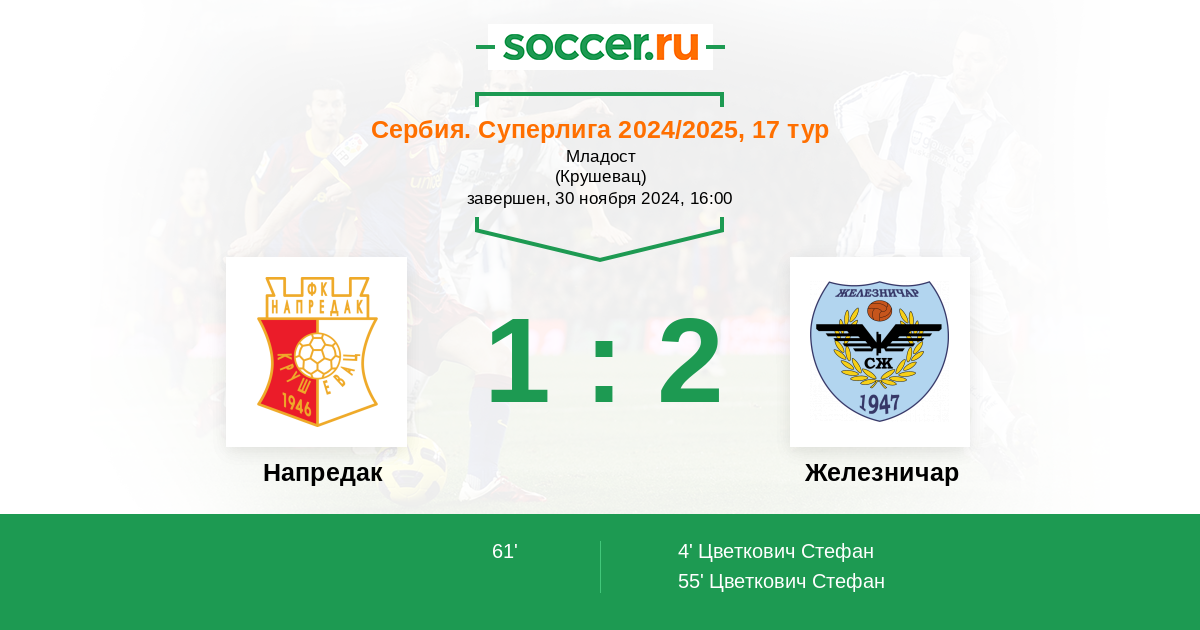 55' (0:2) Цветкович Стефан (11) (Жуниор Секу Саного (35))
