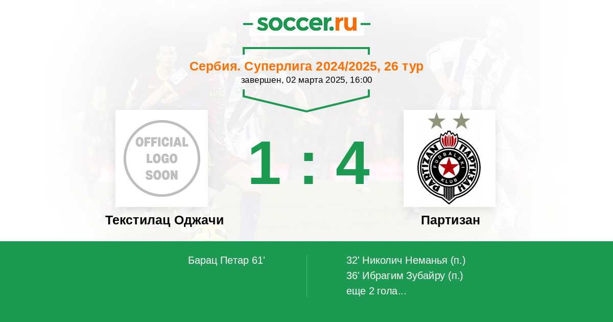 Протокол матча Текстилац Оджачи против Партизан