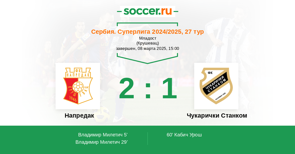 60' (2:1) Кабич Урош (70) (Милоевич Неманья (8))