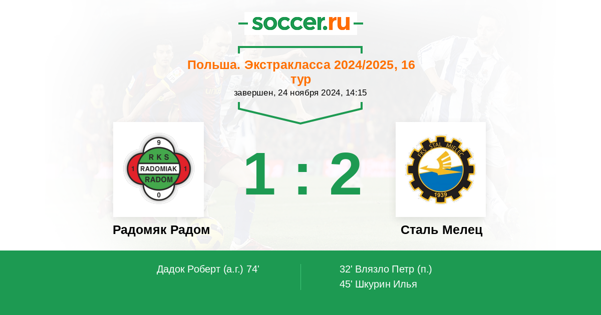 74' (1:2) Автогол Дадок Роберт (96)