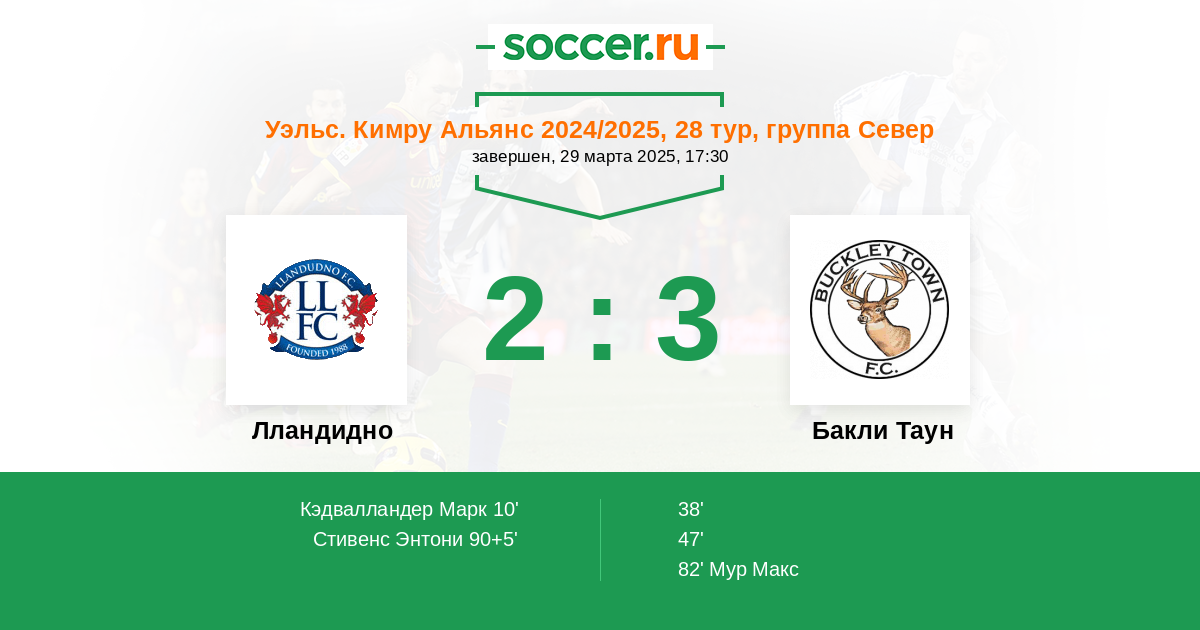 Лландидно - Бакли Таун ! Хоть команды и находятся по соседству в тур . таблице . Игровую форму имеют разную - хозяева на подъёме , гости соответственно на спаде .