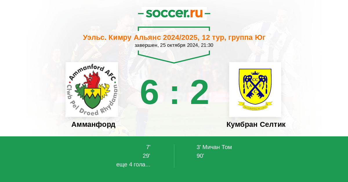 Амманфорд - Кумбран Селти ! Играют 2 весьма забивные команды , которые в очных встречах огорчают друг друга часто и не по одному разу . Надеюсь И этот матч исключением не будет . ТБ .