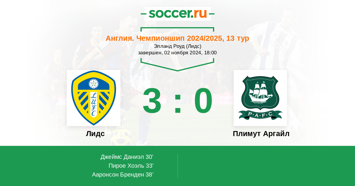 Протокол матча Лидс против Плимут Аргайл