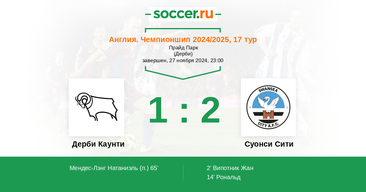 Протокол матча Дерби Каунти против Суонси Сити