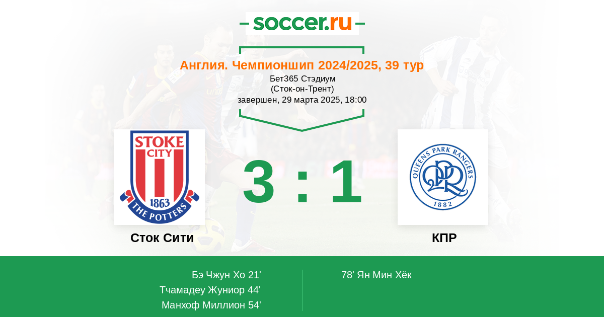 Протокол матча Сток Сити против КПР