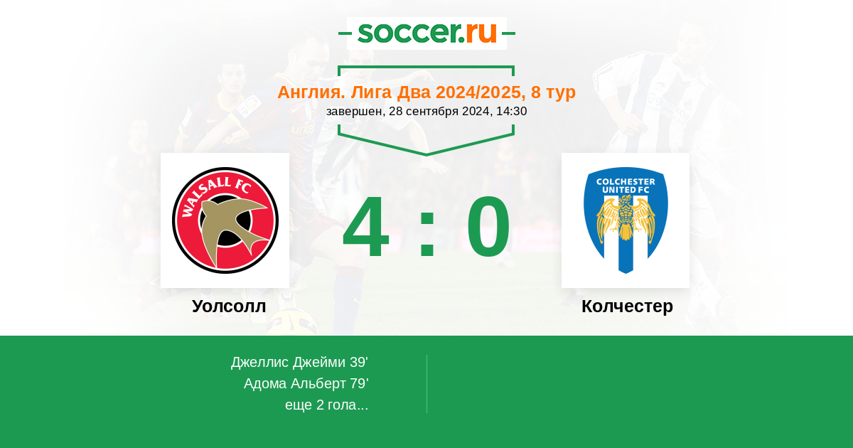 Протокол матча Уолсолл против Колчестер