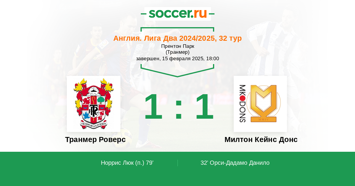 Протокол матча Транмер Роверс против Милтон Кейнс Донс