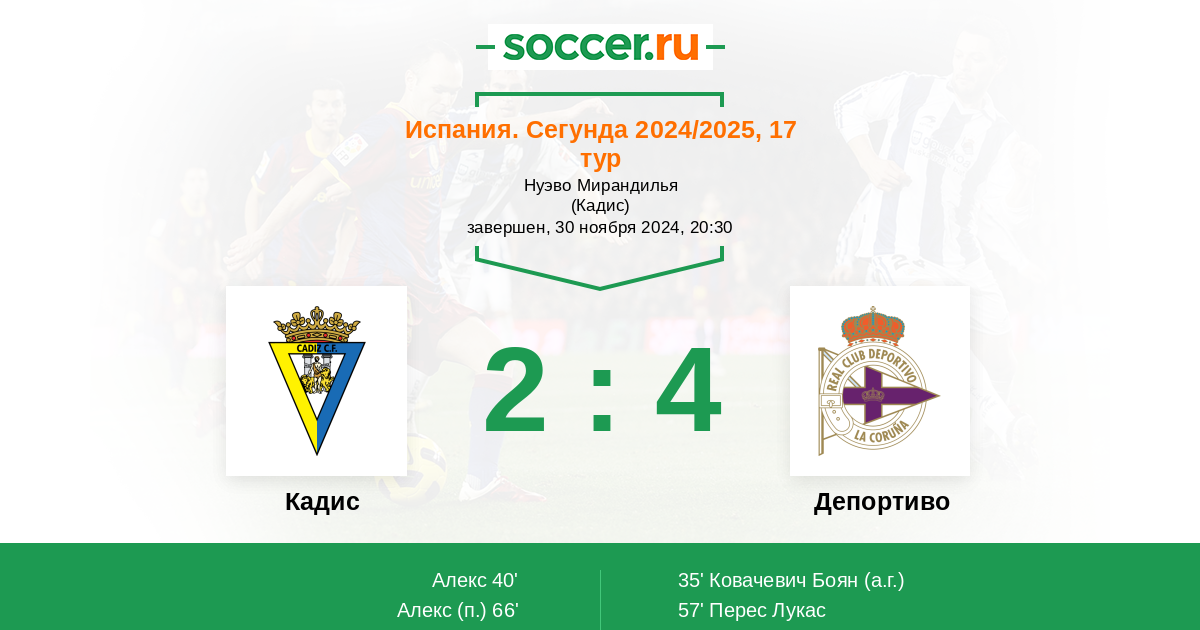 Протокол матча Кадис против Депортиво