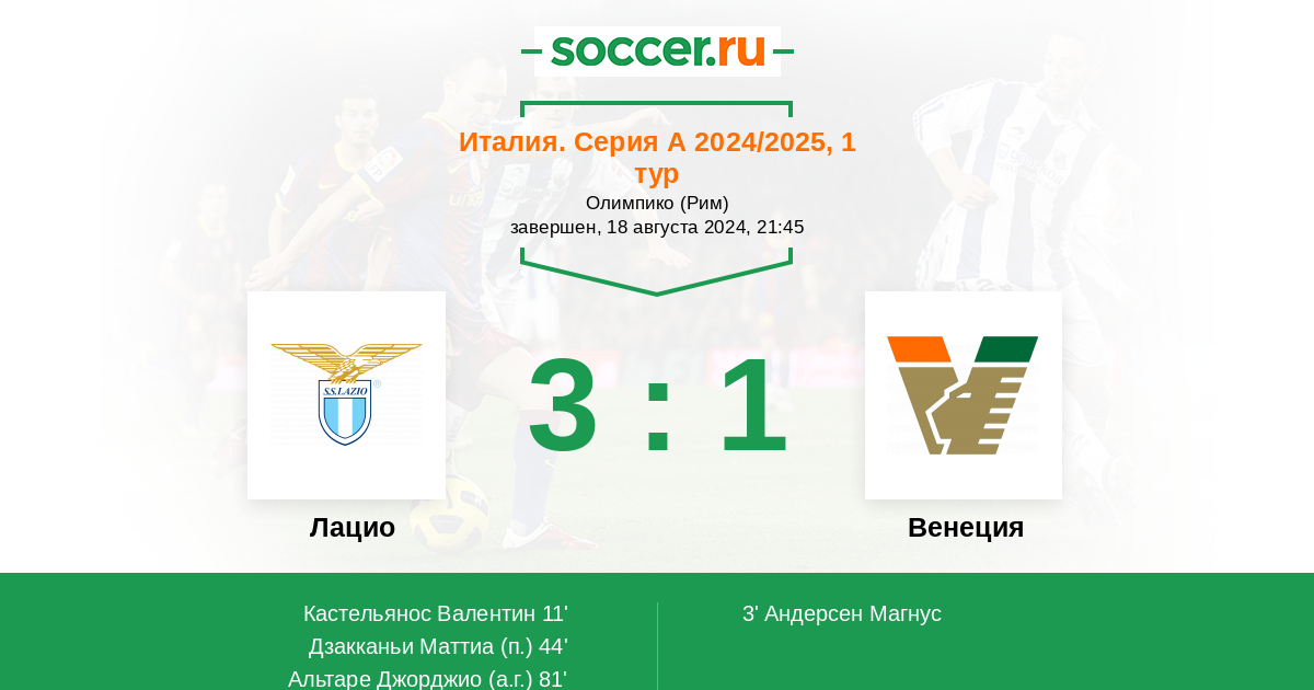 В предстоящем матче 1 - го тура итальянской Серии А между командами Лацио Рим и Венеция , более чем явным фаворитом на победу является команда хозяев Лацио, так как они играют лучше.