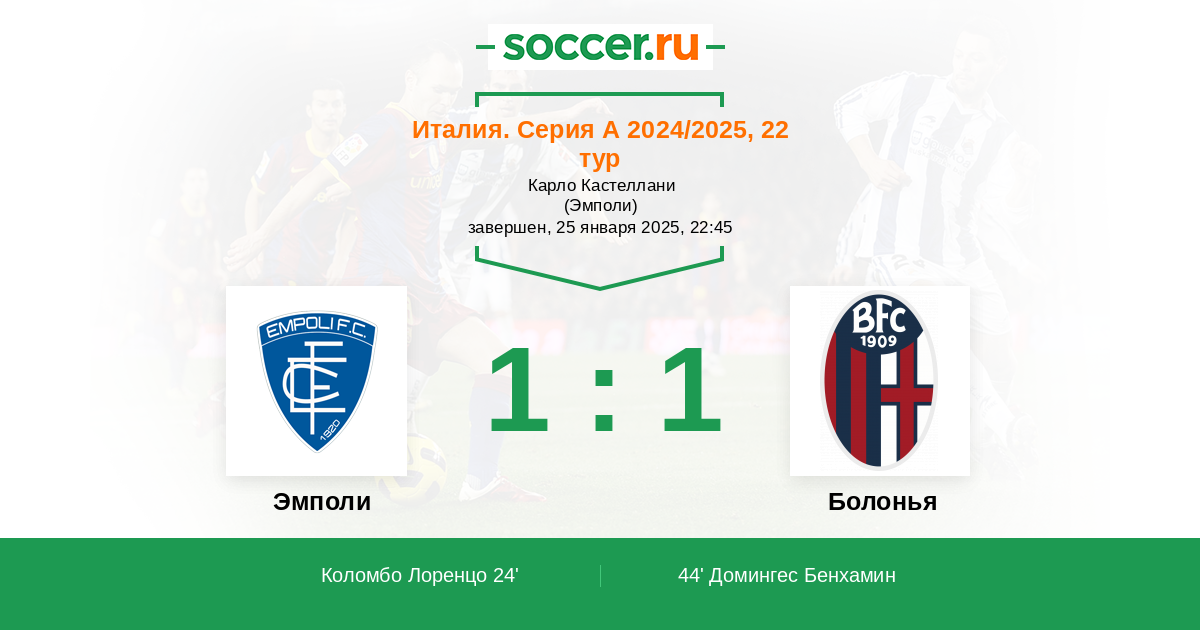 24' (1:0) Коломбо Лоренцо (29) (Пеццелла Джузеппе (3))