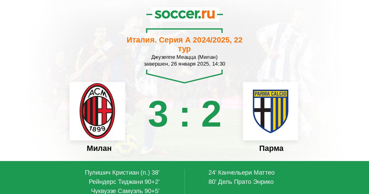 Матч Милан-Парма 26 Января 2025 обещает быть напряженным. За последние 10 матчей домашняя команда забила 13 голов и пропустила 9, одержала 6 побед, 3 ничьих и 1 поражений. Гостевая команда за последние 10 игр ,забила 12 голов и пропустила 19, зафиксировав 3 побед, 2 ничьих и 5 поражений. Последняя встреча команд 24 Августа 2024 завершилась с результатом 2-1. Ожидается увлекательное противостояние.