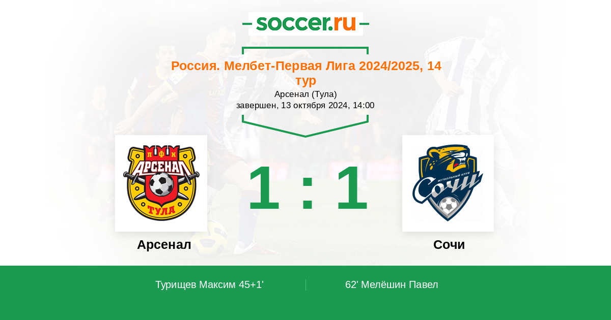 Думаю, интересная игра предстоит. Назвать фаворита сложно. Сочи разыгрался, но за Арсеналом домашнее поле. Трудно предугадать развитие событий в предстоящей игре, но мне думается, что очень голевой игра не будет.