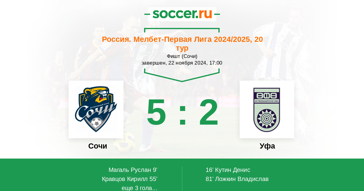 В матче российской Первой Лиги между командами Сочи и Уфа смею предположить победу хозяев, потому как на их стороне поддержка местных болельщиков, плюс результативнее игра в атаке и надёжнее оборона.