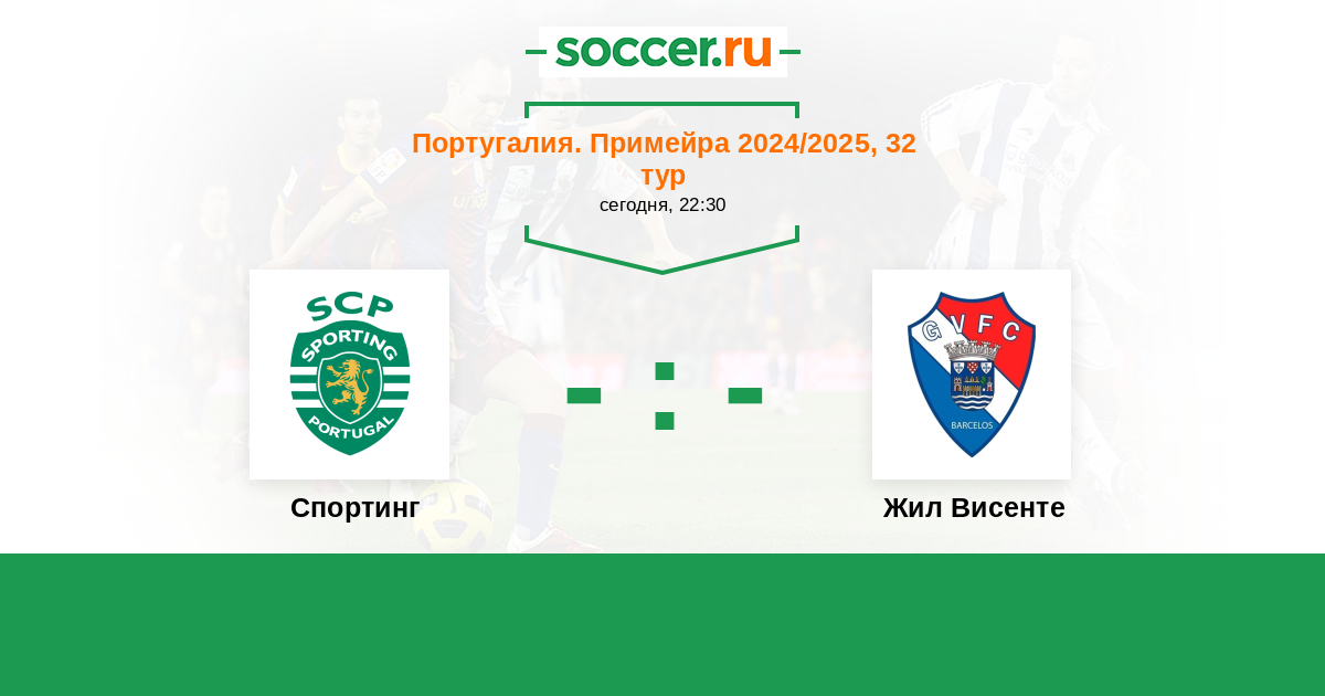 Спортинг - Жил Висенте ! Значение этого матча для хозяев трудно переоценить . Мотивации хоть отбавляй . Гости хоть не на что уже по большому счёту не претендуют , но отличится вполне будут не прочь , если хоть малейшая возможность представиться.