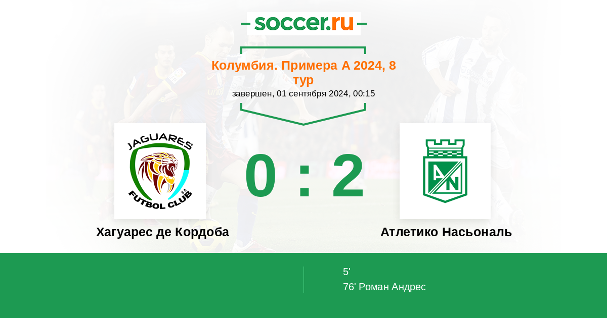 76' (0:2) Роман Андрес (6) (K. Parra Atehortua)