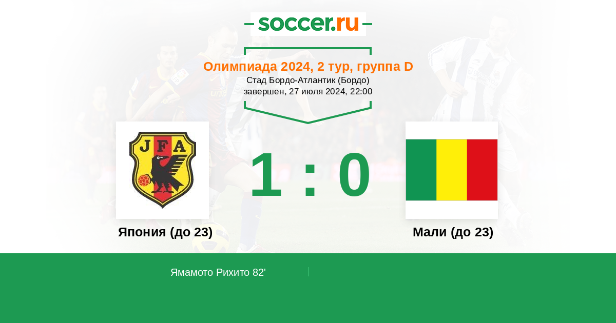 Япония ( до 23 ) - Мали ( до 23 ) ! Японцы находятся в отличной форме и не случайно являются фаворитами этого матча , и скорее всего одержат победу , но африканцы , всё же должны оказать посильное сопротивление .