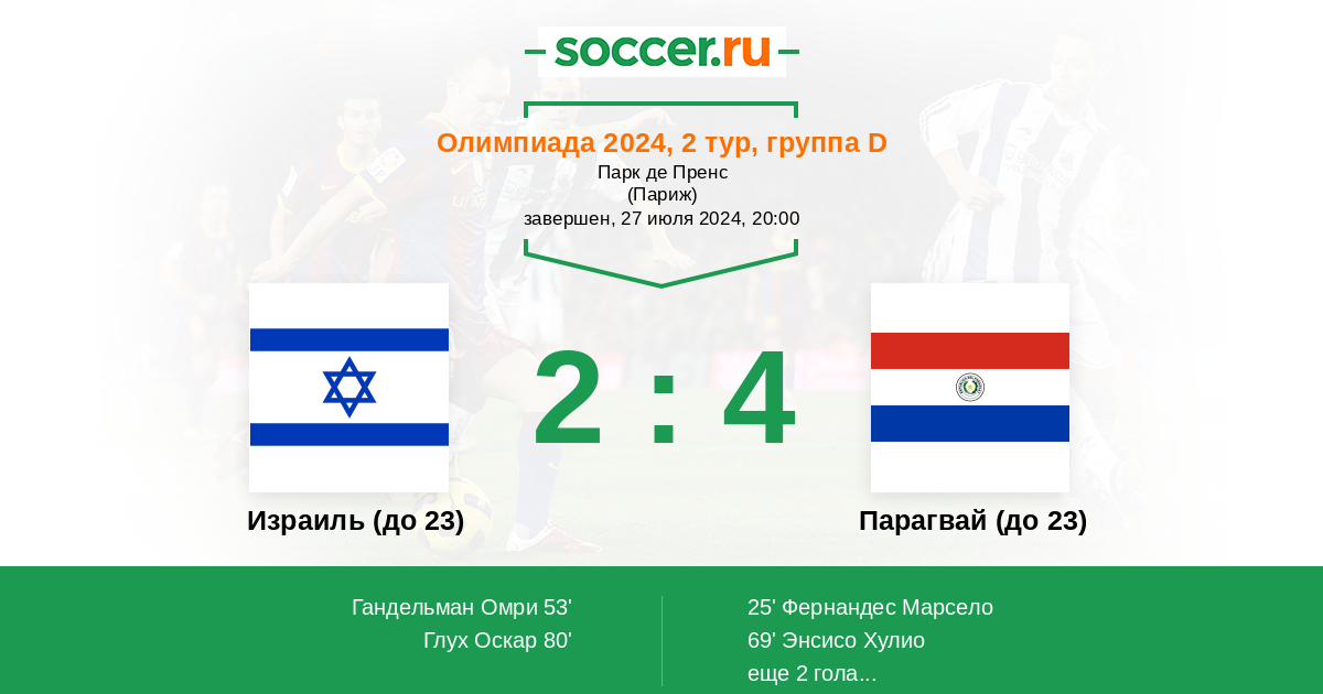 Израиль ( до 23 ) - Парагвай ( до 23 ) ! Израильтяне невнятно провели стартовый матч и будут стараться исправить ситуацию . А парагвайцы вообще " влетели " японцам и конечно хотят хоть как то реабилитироваться . Жду голов .