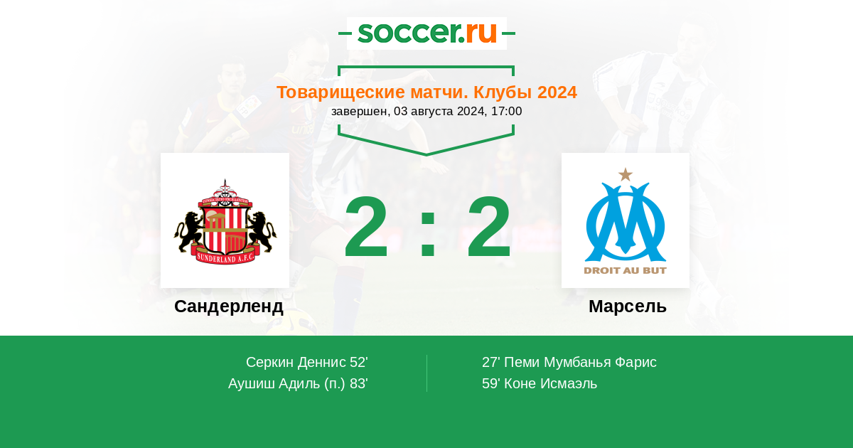 Протокол матча Сандерленд против Марсель