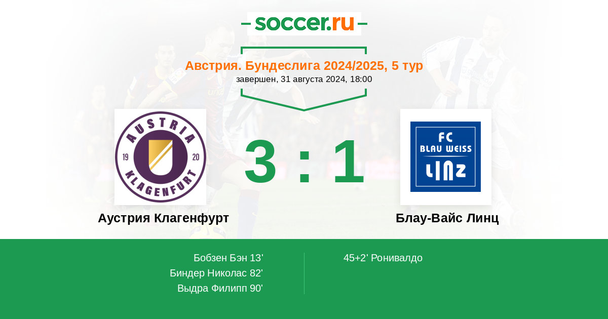 Протокол матча Аустрия Клагенфурт против Блау-Вайс Линц