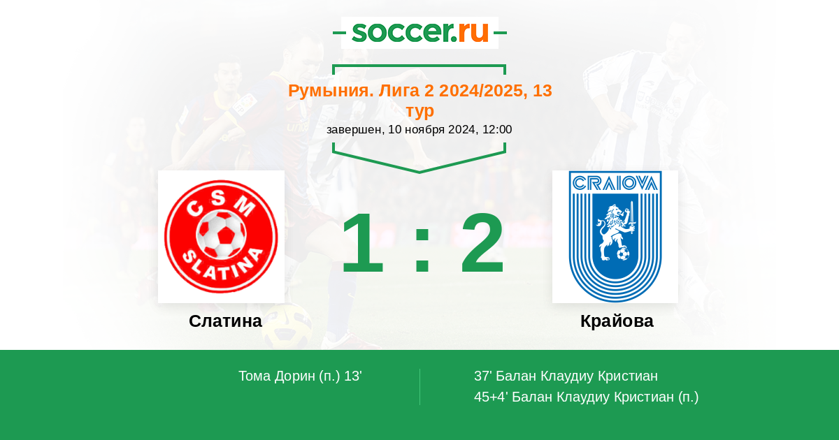Протокол матча Слатина против Крайова