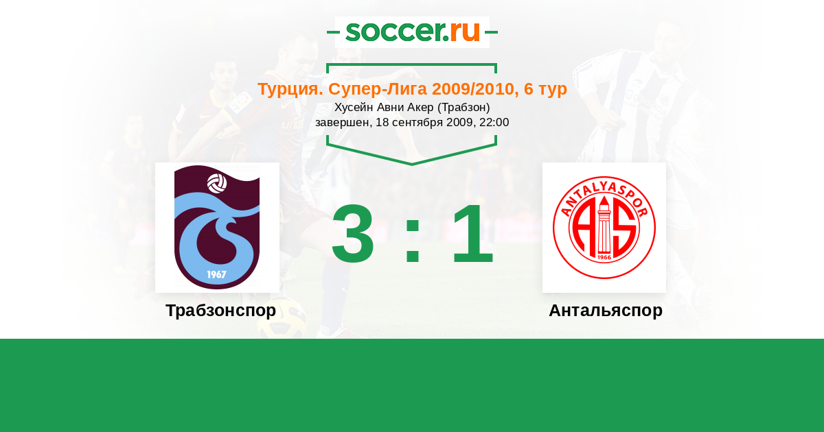 Турция. Суперлига 30.08.2010 Антальяспор Логотип футбольный клуб Антальяспор 0:0 Логотип футбольный клуб Трабзонспор Трабзонспор