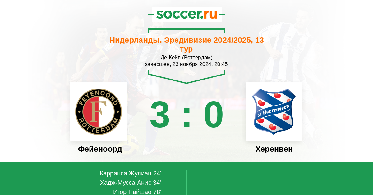 Протокол матча Фейеноорд против Херенвен