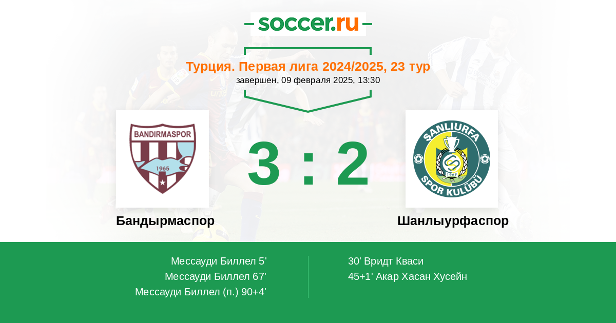 Протокол матча Бандырмаспор против Шанлыурфаспор