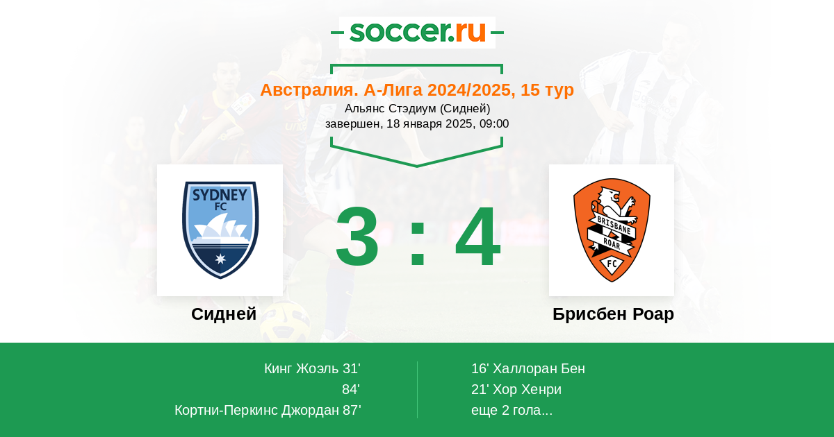 Протокол матча Сидней против Брисбен Роар